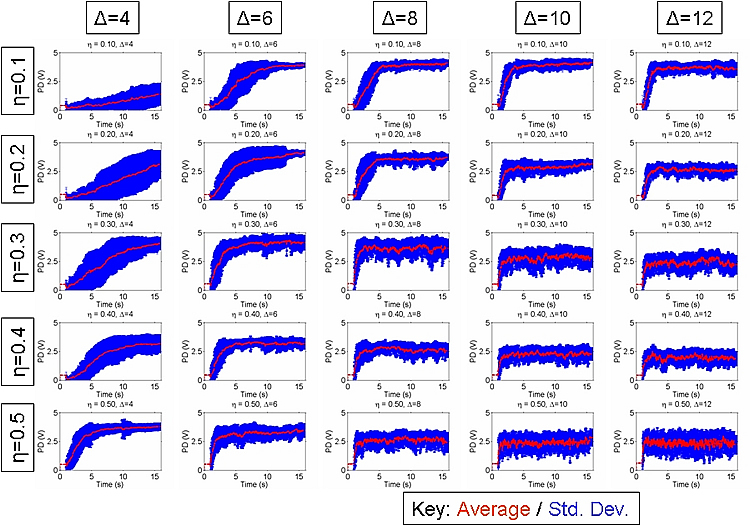 Metric AO Traces for Varying Gain (eta) and Varying Step Size (delta)