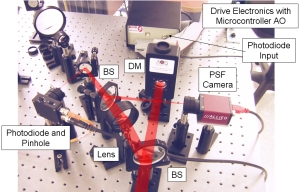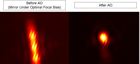 We recently modified our drive electronics package to enable the user to connect an external metric (typically a photodiode) to the box and use it to do closed-loop metric adaptive optics. We have currently implemented stochastic parallel gradient descent (SPGD), but have other algorithms in the works. Below is some data taken in the lab at AOS. Call us for more iinformation.